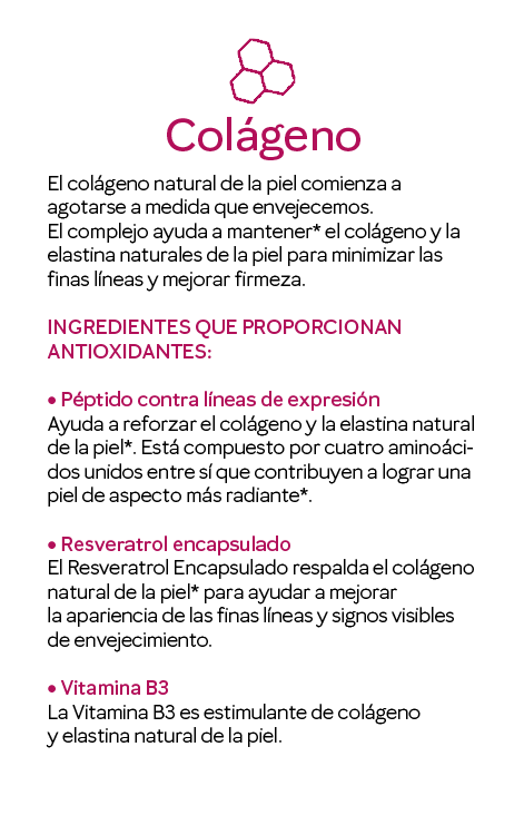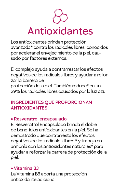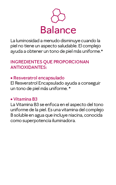 Probado científicamente, investigado exhaustivamente y presentado en múltiples conferencias científicas a nivel mundial, nuestro eficaz y patentado Complejo TimeWise 3D® ayuda a potencializar los beneficios de cada uno de los productos de la Rutina Ideal TimeWise®, ayudando a proteger la piel del envejecimiento prematuro. La combinación de Resveratrol Encapsulado, Vitamina B3 y Péptido contra Líneas de Expresión, cubren tres dimensiones fundamentales de la piel que ayudan a proteger contra las causas del envejecimiento prematuro visible de la piel. Considerado como el ABC de la piel.