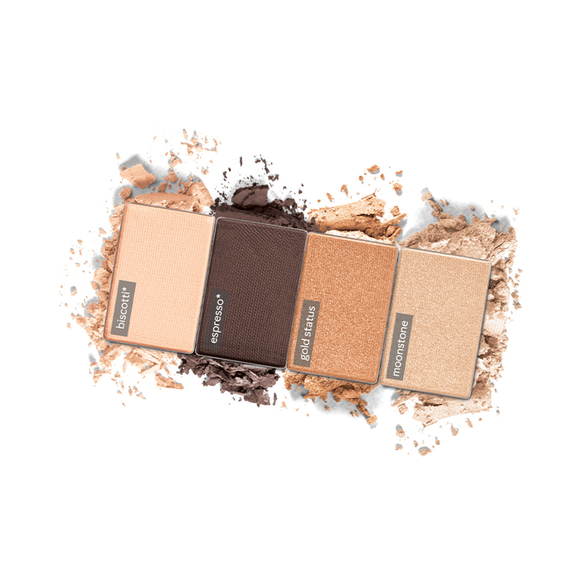 Incluye 4 Sombras para Ojos Mary Kay Chromafusion® en los tonos: Biscotti, Espresso, Gold Status y Moonstone.